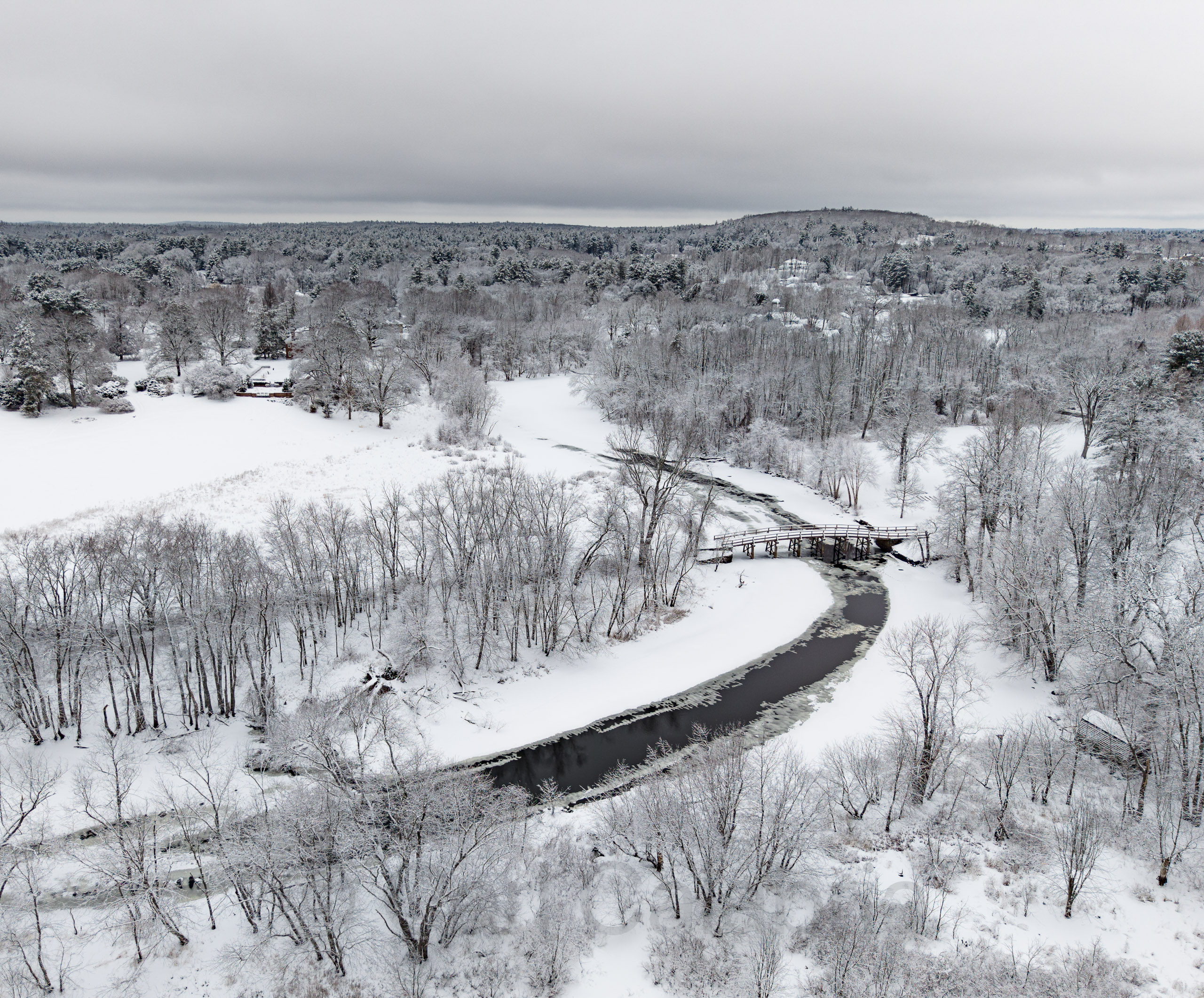 Last night, we received 3 inches of wet snow, the kind that sticks to tree branches, creating a beautiful winter wonderland. After clearing the driveway, I set out for some aerial photography and a honey-do list of errands. Pictured above is a distant view of the Old North Bridge and Visitor Center. My shopping list included an offset spatula, Portobello mushroom caps, candles, a zucchini, a red onion, and a yellow squash. This mission required stops at three different stores and was not completed to the satisfaction of my boss. I forgot the candles, and apparently, I do not know the difference between a zucchini and an English cucumber. In my defense, I doubt Jeanine knows the difference between a Forstner bit and a brad-point drill bit.