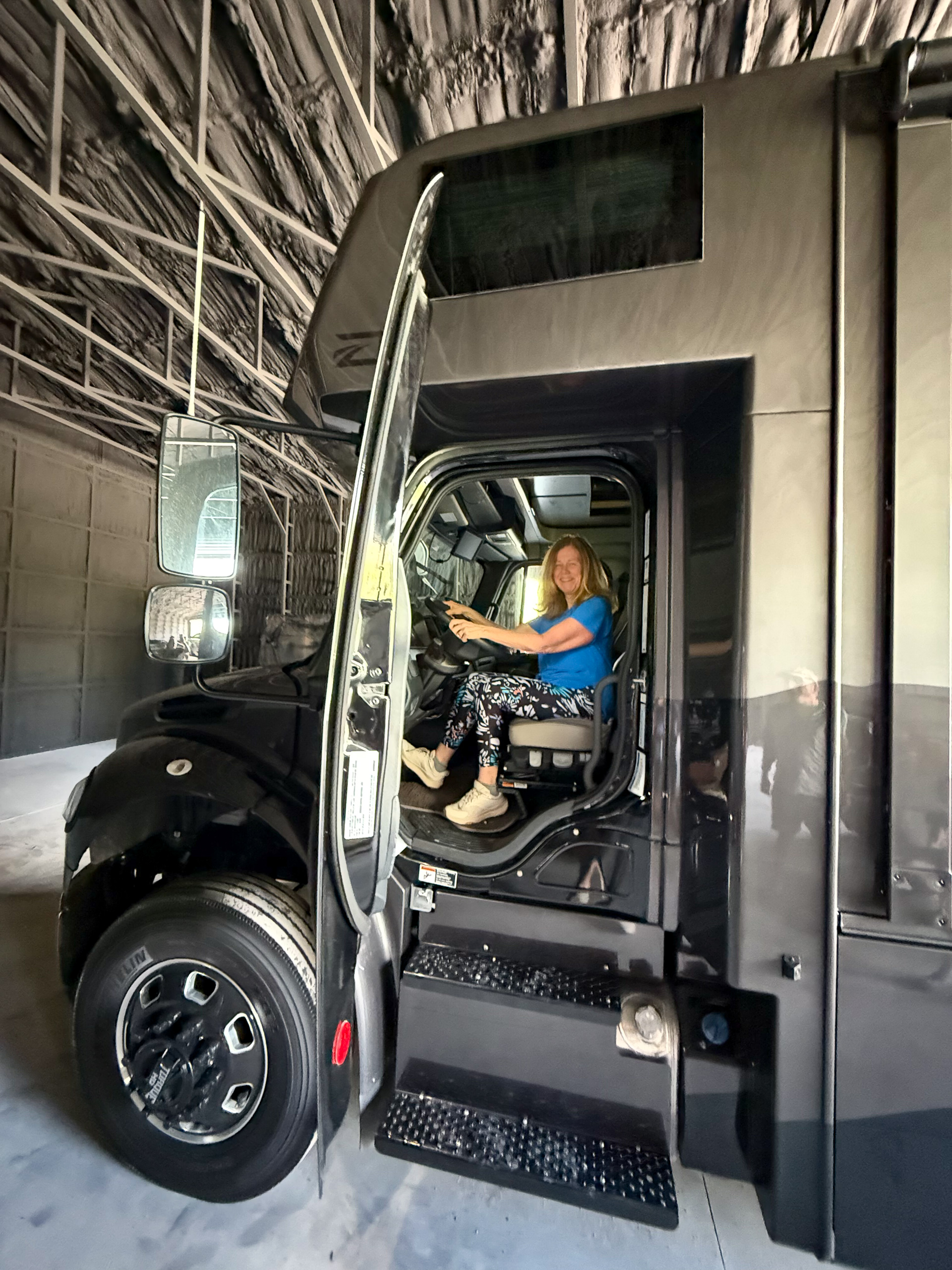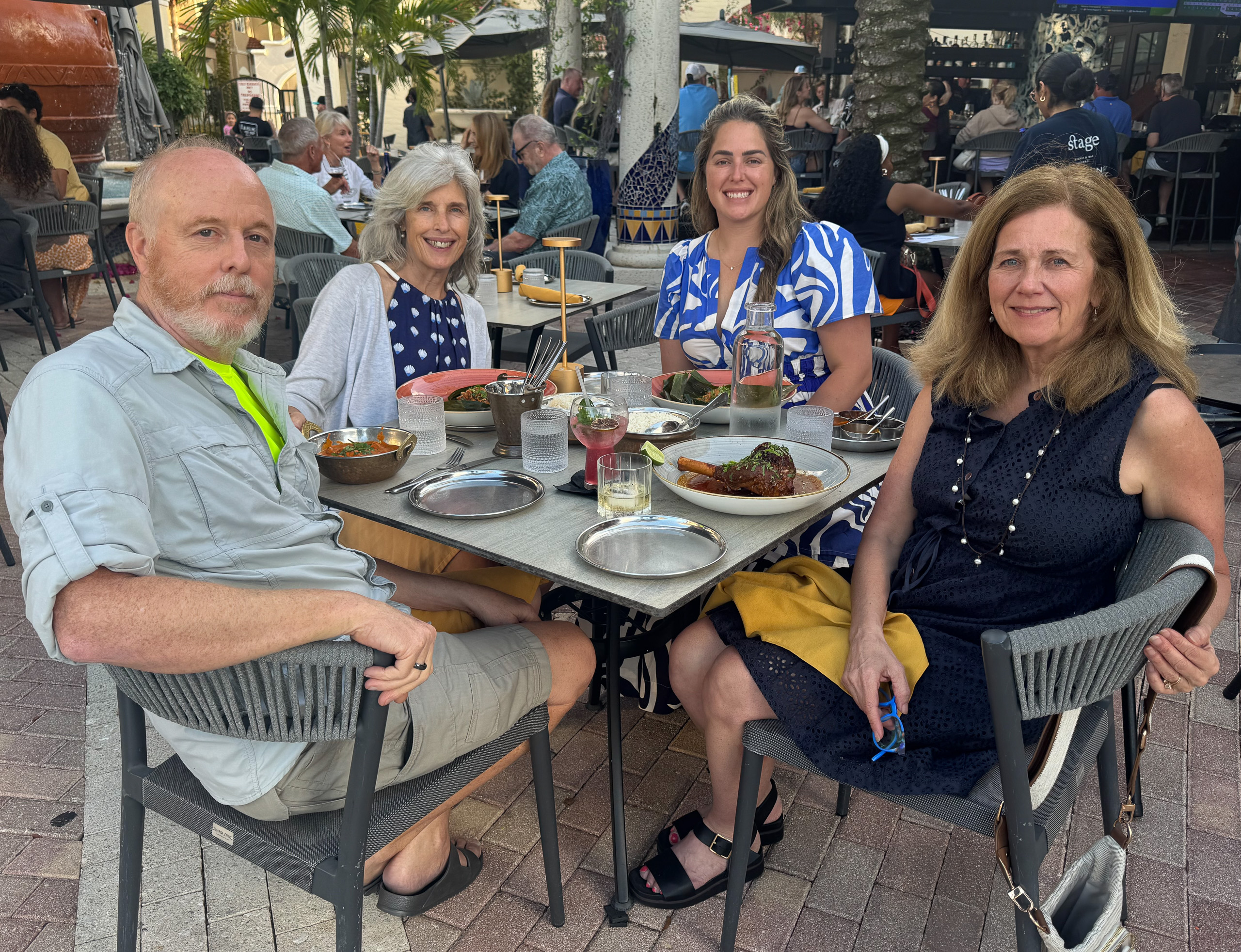 Jeanine shared these photos from Florida, where she is getting ready to embark on an RV adventure with her friend Kris (sitting opposite). Check out her smile as she gets comfortable in the driver’s seat. The grin is not because she is looking forward to piloting a big rig. It is because she is actually in the much larger RV of Kris’s son-in-law, and she knows I am worried about her driving something big and unfamiliar to her. Pictured below, she enjoys a day-before-her-birthday dinner with Kris’s husband, Rob, and daughter Bethany.