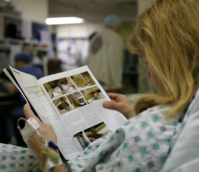 Jeanine had her second bunionectomy (left foot) this morning. Having forgotten her own reading material she was left with the magazines I had brought along. Here she is reading about how to build your own scroll saw while we wait for the antibiotics to be administered.