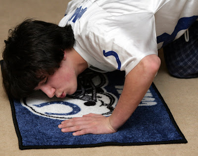 For those wondering how the Colts could come from behind to defeat the Patriots in such dramatic fashion they need only study this photo for the answer. At crucial moments of the game, Kyle would pause to kiss his Colts door mat which he places strategically in front of the TV. Each kiss was followed by a Colts touchdown or Patriots turnover. The Pats got their early lead because Kyle was attending his Owl program and did not start watching the game and making out with his carpet until the end of the first quarter.
