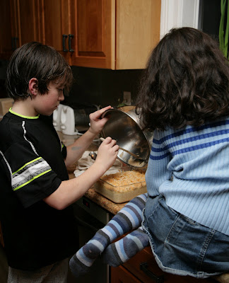 Today is Maya’s family night. She chose to prepare a macaroni and cheese casserole from the EmerilLagasse children’s cookbook she received from her grandfather for Christmas. Nico is shown spooning on the final layer, but Maya did the bulk of the work including preparation of a special spice mixture called Baby Bam.