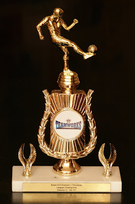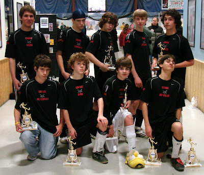 Kyle’s team, Chaos, played three back to back games this evening to win their divisional championship. The team gave up only one goal through the tournament and won the final match with a 3-0 shutout. Kyle had two goals and several assists. I do have a nice photo of the team, but I am sure this is the one they will all want to see.