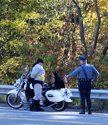 Occassionally, I take a photo for which I have no comment. We were having lunch alfresco when I noticed the flashing lights of a state police cruiser. The trooper asked Batman to tuck in his cape before returning to the Batcycle (seriously)