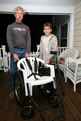 Today was a pretty big day for Nicolai. He was featured on the front page of the Boston Globe, was interviewed on NPRs All Things Considered by Michele Norris, and met the Founder and President of the Free Wheelchair Mission at a dinner gathering thrown in his honor. The Globe is reporting that Nicolai is the youngest disabled climber to summit Kilimanjaro after checking with officials in Tanzania. NPR reported that I am an accomplished professional mountain climber (who knew, I always thought I was a professional engineering manager). Don Schoendorfer, pictured here with his low-cost wheelchair design is an MIT mechanical engineering graduate who founded the Free Wheelchair Mission and whose work has made it possible for nearly a quarter of a million disabled poor to receive the gift of mobility.