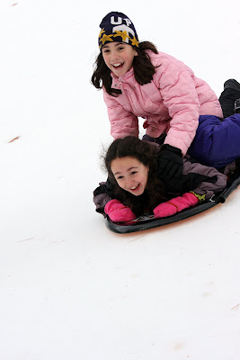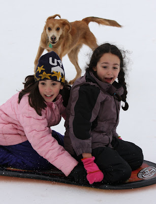 Maya and Sarinaugh sledding in the backyard. Recent warm temperatures and rain followed by sub-zero nights have left an ice coating on top of a 12 inch base. Perfect conditions for sledding.
