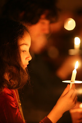 This evening the family attended the Christmas Eve service at First Parish which culminates in the singing of Silent Night by candle light. Despite the fact that only one and a half members of the family can sing to save their life, everyone participates to the best of their ability.
