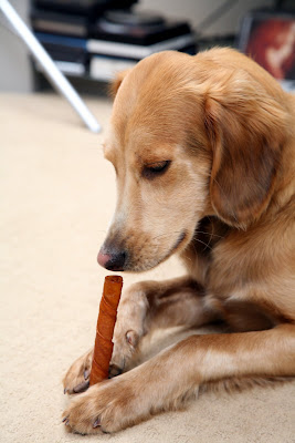 Nala also received several gifts including these rawhide sausages. Although she did seem to enjoy them, she favored gnawing on our firewood kindling until we had a rug covered with small toothpicks.