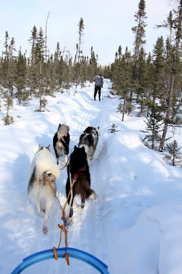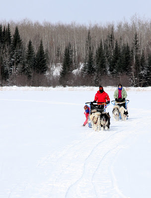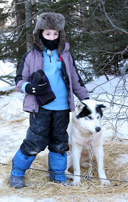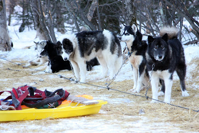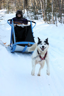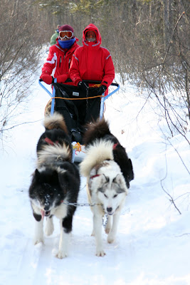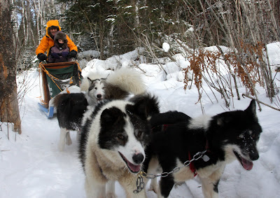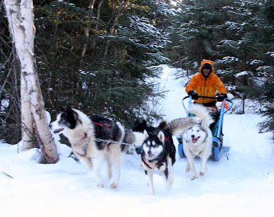Rory spent much of the day solo behind three dogs and managed to survive several tree collisions no worse for the wear. It must be understood, that the musher has little ability to stear the sled. It simply follows the dogs where ever they choose to run. Going up hill is no problem because the pace is slow and you often have to help the dogs by running along side or pushing. Down hill is where things get tricky. Any turn at the bottom of a hill is going to be a challenge. If a tree happens to be there it is likely to be painful as well. The trick is to keep tension on the gang line as you approach the turn and to use your body weight to slide the back end out at just the right moment. Easier said than done.