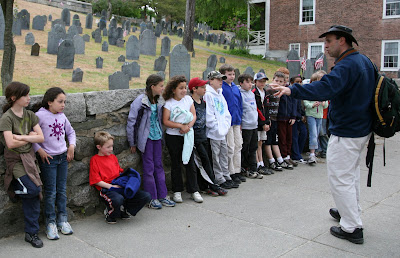 We started at the Hillside Burying Ground where we lined up the children before seperateing them into smaller groups. I had Maya, Julia, Kyle, Avi, Connor, Jack and John. Our tour focused on the pre-1775 homes and I shared information about life in Concord at that time, the architecture of the homes, the families that lived there and some funny stories we had learned about during my training the week before.