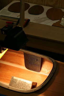 Today I made great progress on the kayak. Here I am using a high intensity lamp to speed the epoxy cure time on the hip plates (this is where the back band attaches). I made a nice little reflector (triangular affair sitting on the bottom of the hull) to focus the heat from above on both plates. In the background you can see two hatch cutouts and one of the two bulkheads.