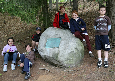 Our walk concluded at the Wayside Inn and the kids paused for a group photo framing a plaque commemorating Nathaniel Hawthorne. The careful observer will note that I have lost one of my charges. Fear not for he is behind the rock. I will say that the boys in this group were rather rambunctious and it took more than a little self restraint to keep from tying the whole lot together.