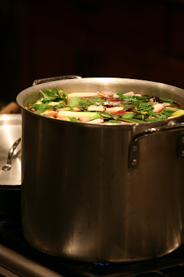 Jeanine launched her new business venture this evening. The Earth Mama hosted a healthy cooking lesson for eleven participants who each left with a container of Jeanine’s Special Broth, seen simmering here, renewed appreciation for the dreaded pressure cooker, and new found love for Seaweed Salad. The event was a great success and Jeanine had that happy smile she gets when working with industrial size cooking vessels.