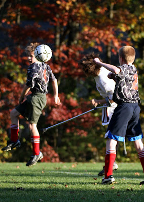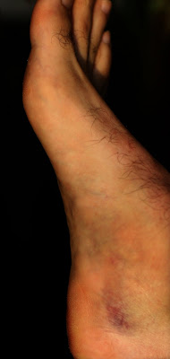 Five minutes into my soccer game this morning I was kicked in the ankle (note the variety of unnatural colors). The free kick this earned was not worth the pain I suffered for the rest of the match or the potential impact on next week’s game. We played Lexington who beat us 5-1 on their field the last time we met. On our turf we were able to achieve a 1-1 draw. I had a number of nice break away opportunities but was fouled from behind on all but one. On my one chance, the goalie did a good job of cutting down the angle and my shot missed wide by inches. I redeemed myself five minutes later by setting up our only goal with a nice cross from the end line.
