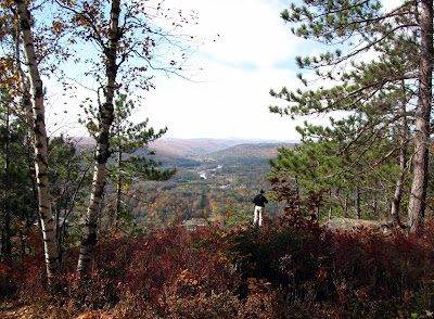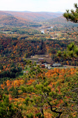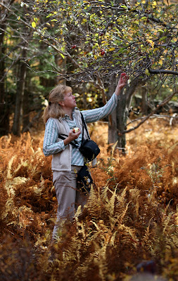 Next we hiked up to a place called High Ledge which overlooks the Shelburne Falls Valley. On the trail Jeanine pauses to pick apples from a tree along the path. The search for a perfect apple would eventually find Jeanine climbing up into the tree. Eventually she settled on three apples which would be consumed later on our journey.
