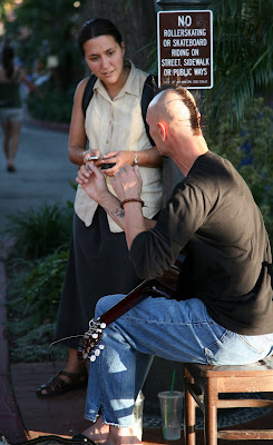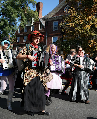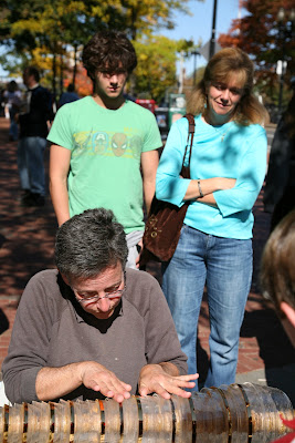 This musician plays an instrument of her own design consisting of nested glass bowls of increasing diameter on a long pole connected to a crank. A member of the audience was asked to turn the crank while she moistened her fingers and applied them to the various bowls to play music using the harmonic vibration of the glass. The sound was as beuatiful as it was difficult to describe.