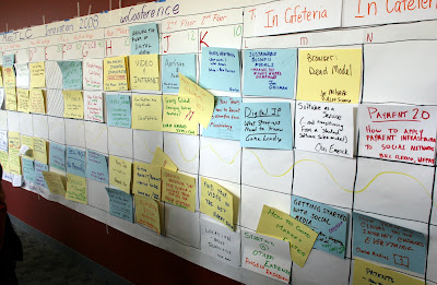 Today I took a vacation day to attend the Massachusetts Technology Leadership Councils Innovation 2008 unConference. Participants created an agenda in real-time and broke off into small groups to discuss issues of common interest. It was a great networking and learning opportunity. Pictured here is the ad hoc meeting schedule.