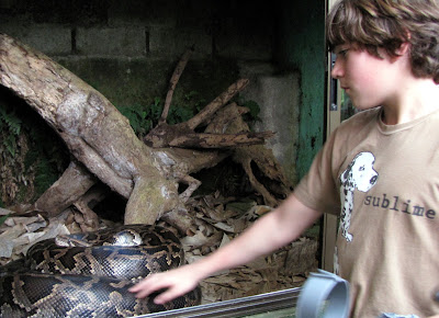 Our guide was a very knowledgeable naturalist with a good sense of humor. He had personally captured many of the creatures we were viewing. The boxes on the table contain tarantulas and he was more than happy to remove the lids so I could get in close for photos. Behind Jeanine is a shadow box full of beatles, some of which are almost as big as the dogs in this country. This may be a slight exageration, but you sure as hell would not want to find one of these things in your shoe.