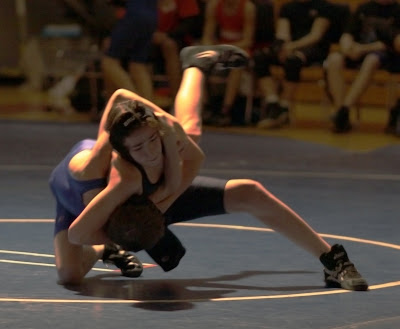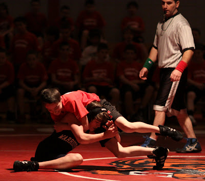I spent the afternoon with Nicolai today at a wrestling double dual meet (4 teams). Nico won his first match 16-0 and his second match, pictured here 15-0. Nico has developed a very successful head and arm throw (my favorite high school take down) and used it four separate times for a total of twenty points.