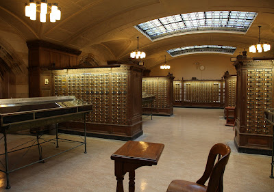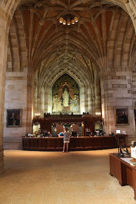 Sterling Memorial Library is architected in the style of a cathedral per the wishes of its benefactor but all religious symbols have been replaced with Yale inspired secular icons.