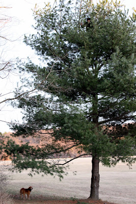 Frequent visitors to this blog realize that the arrival of spring is generally accompanied by an increased number of bird photo postings. This evening after work I captured the extremely elusive One-legged Fearless Nutjob perched high in one of our evergreens. This flightless species is quite rare because the male birds frequently fall to their deaths from high nests before having a chance to mate. It will take a skilled eye to spot this black feathered, white faced bird against the dark pine needles. Click on the photo if you need a magnified view.