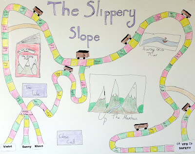 Maya created this board game for a school project. I was enlisted to beta test it with her. Not shown in the photo are the cards that are placed over the Too Late and Close Call outlines. It was really a lot of fun and reminded a lot of Chutes & Ladders.