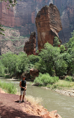 Last night we arrived at the Watchman Campground in Zion National Park and this morning we set out for our first hike. Our destination, pictured here, is Angel’s Landing. The 5 mile, 5 hour round trip requires an ascent of 1500 feet. If you click on the photo you will notice Jeanine and the kids in the lower left corner as they approach the base of the towering monolith.