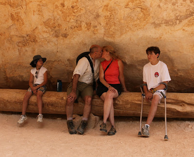 When we reach the floor of the canyon we find a nicely shaded seating area where Jeanine and I are moved to share a kiss. One child captures the moment, another looks on with curiosity and the last flashes a look of disgust. Presumably these same children understand that if not for such activities they would not even be here.