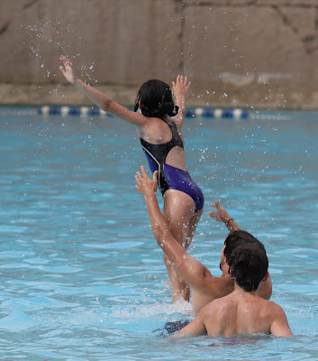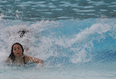 By the time we settle into our hotel rooms the water park is ready to close so we settle for a photo of the action from our room and the kids look forward to the next morning with great anticipation. Every 90 seconds, a large waves emerges from the flat section at the back of the beach shaped pool. A portion of the lazy river is seen in the upper right area of the photograph. A stong current carries swimmers around the circuit is about two minutes.