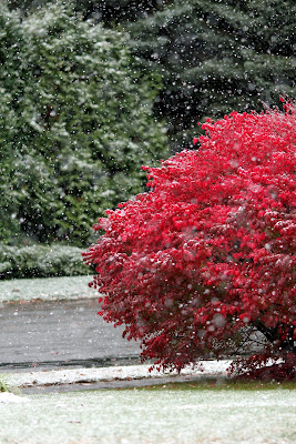 Later in the day, the rain turned to our first snowfall of the year. It may be necessary to click on the photo to see the snowflakes. Meanwhile, our burning bushes are in their full fall glory.