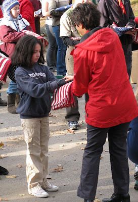 Maya and Jeanine participated in a ceremonial American Flag Retirement ceremony today at the Sleepy Hollow Cemetary replete with fife and drum band, bag pipes, the playing of taps, and a three cannon salute. Girl and Boy Scouts folded flags to be retired and then handed them off to a military family being honored for their father’s recent return from Iraq. They are then passed to a fire marshall in full uniform who respectfully places the flag in a container in which it is burned.