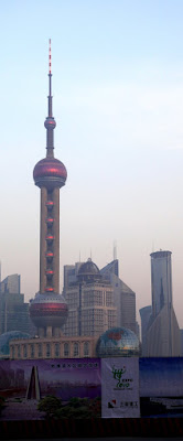 The ionic Oriental Pearl Tower. At 1,535 feet high, it is the tallest completed tower in Asia. The tower features 11 spheres, big and small. The two biggest spheres, along the length of the tower, have diameters of 164 ft for the lower and 148 ft for the upper. They are linked by three columns, each 30 ft in diameter. Regrettably this was the best photo I could manage.