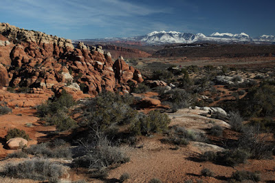 As sunset approaches, Mark and I make the strenuous climb to iconic Delicate Arch. We are both acrophobic and the last few hundred feet are along a narrow cliff ledge. Although Mark makes it past the ledge he elects to descend immediately rather than waiting as I will for golden light which necessitates a return in darkness. Only during the winter months does the angle of the setting sun afford a near shadowless image. Add in snow caps on the La Sal Mountains and it does not get any better than this.