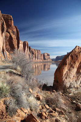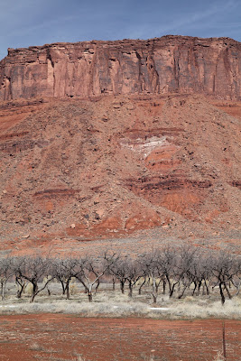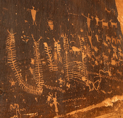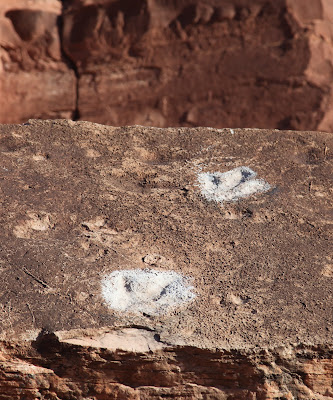 The petroglyphs are about twenty feet above the ground on along a vertical wall and it was not clear to either Mark or I as to how they were placed there. The dinosaur tracks, highlighted in white, are about twice the size of my hand and required a short but tricky climb to get a close up view.