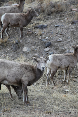 Mark and Jeanine both share a gift for spotting wildlife from a speeding car. Mark spotted a group of male Big Horn sheep on a distant mountainside in waning light. Unbelievable, as they practically disappear into their environment. The herd of females was easier to track down and we ultimately found a dirt road that took us to within feet of them for great close ups.