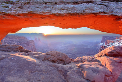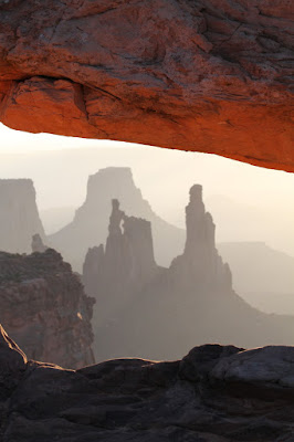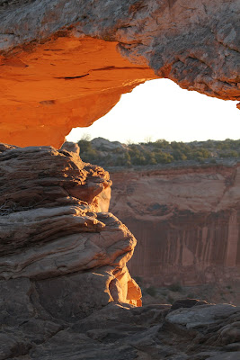 Today, we wake up an hour before sunrise, take down the tent, and make the short hike to Mesa Arch, where we join several other photographers to enjoy the dramatic lighting on the underside of the arch from the sun’s first light.