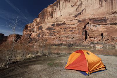 The net result on the day was two happy brothers. We got off the river at about 6:30 pm and drove to Canyon Lands National Park in Utah, arriving just around 11 pm. The campground there was full, and I opted to pitch our tent in the Mesa Arch trailhead parking area.