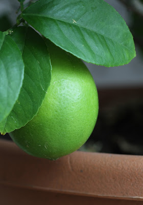 Jeanine has been growing and harvesting her own limes for some time now. This one seems just about ready for picking. There is something very satisfying about growing your own food and I feel lucky to be married to someone who takes pleasure in doing so. UPDATE: I have just learned that these “limes” are actually lemons. A couple days of direct sunlight and they are turning a pretty yellow.  Lemonade anyone?