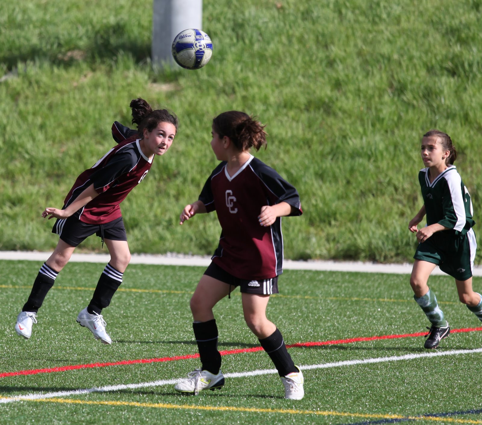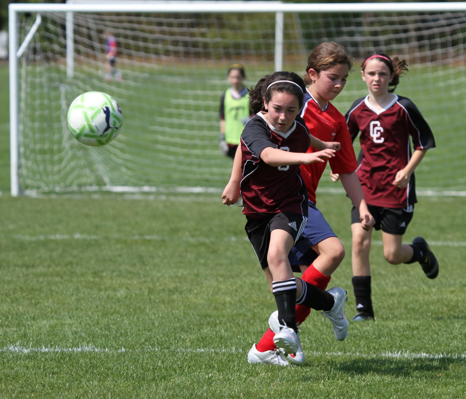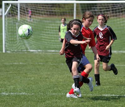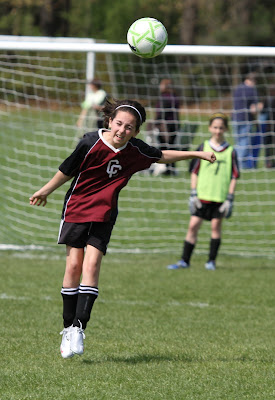 Maya overcame her reluctance to head the ball and did so several times in her soccer match this morning. This in addition to scoring a goal which contributed to her team’s 4-3 victory. In the second photo she charges past an opponent and clears the ball with a powerful kick.