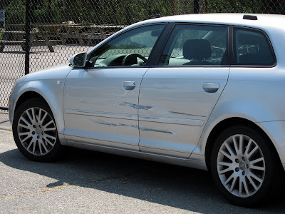 While parked at a soccer field where I was watching Maya play over the weekend, my car was side swiped by another car. Both doors and the rear quarter panel are going to need metal and paint work. Fortunately, the guilty party left a note, was very apologetic and intends to make things right. Still the hassle of getting this work done could not come at a more inconvenient time. I choose, however, to look at the bright side; far better to sustain car damage in this fashion rather than in a collision with precious cargo on board.