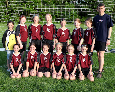 Maya had a makeup game this evening, and the girls were all smiles after a very tough fought 2-1 victory. Alex, their coach, was one of my Concord O40 teammates and the girls have taken their passing to a whole new level under his guidance. My skills as a cat herder have improved considerably, as the near-perfect posing in this team photo suggests.