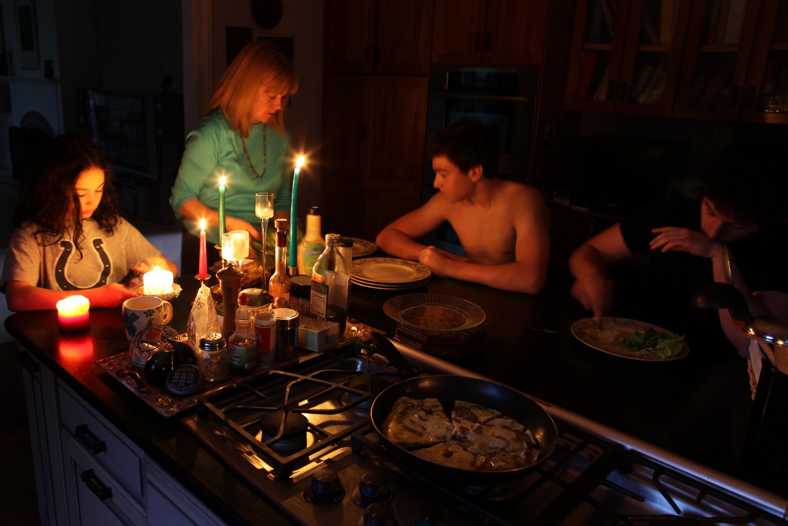 Despite the power outage, Jeanine was able to prepare a nice meal which we enjoyed by candlelight. The absence of TV, video games, and on-line computers throughout the evening, represented a nice departure from our usual routine. The next time I feel like the family is getting too disconnected by all our electronic distractions (I am as guilty as anyone in this regard), I must remember that our circuit breaker box has a single switch that offers a solution and the ability to reproduce the conditions we enjoyed this evening.