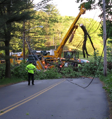 The final leg of my evening commute was delayed while crews removed a fallen tree from the road leading to our neighborhood. In addition to blocking the road, the tree took down electricity, telephone, and cable/internet services to our home for the entire evening. High winds accompanying a brief but intense thunderstorm no doubt caused the incident.