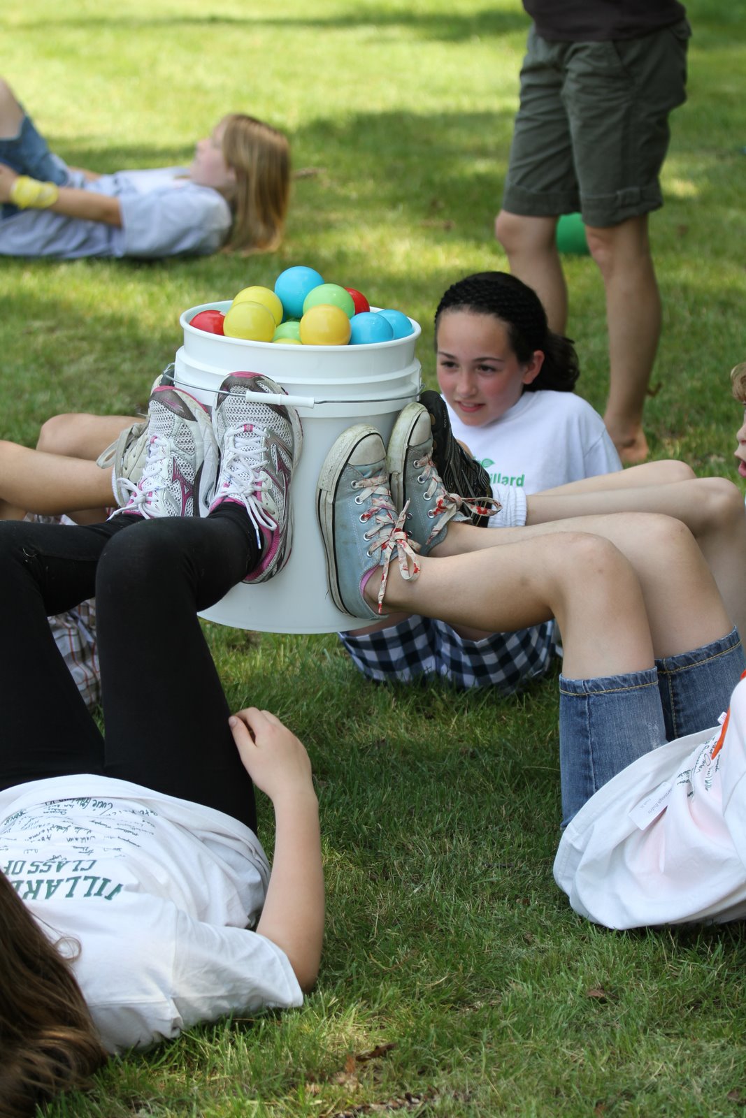 I was able to join the afternoon Fun Day activities courtesy of iRobot summer hours which allow for half day Fridays. In this event, one student is wrapped about the middle in double sided tape as their partner guides them, wheelbarrow style, over a course strewn with plastic balls. The goal is to pick up a many balls as possible using the tape. Still photos cannot convey the hilarity of this event.