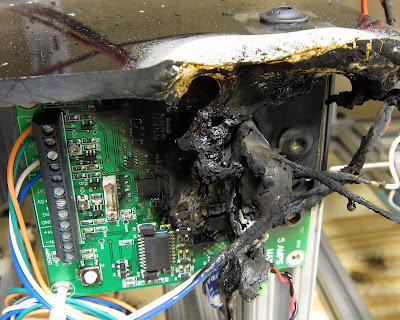 Nothing like a “thermal event” in one of my test labs at work to spice up the day. A shorted motor in a test fixture induced a failure in the circuit board that was controlling it producing enough heat to melt everything in the vicinity resulting in a plume of acrid smoke. Before releasing a product we conduct a battery of stress tests to ensure the quality of our designs. These tests run 24/7 in unoccupied labs. In this case we were testing a wheel assembly and after 2000 hours of operation the brushes in the motor wore out and the springs which support them shorted together. Far better that we discover this failure mode in our labs rather than in a customer’s home and the incident will result in design improvements and a new smoke detection/power interruption system for all our test labs.