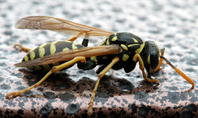 I encountered this Yellow Jacket on our porch. I was able to get a reasonable photo because it seemed rather lethargic and not too interested in stinging me (as I approached to within an inch with my macro lens). I did a little research and learned that they are members of the wasp family and that males die shortly after mating. I believe this may have been the fate of this otherwise healthy looking fellow. Not a bad way to go, all other possibilities considered.