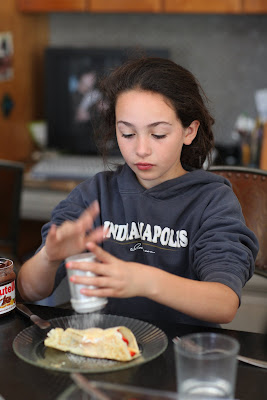 Maya is now 11 years old. Her day stated with French crepes filled with fruit, whipped cream, Nutela and topped with powdered sugar. Nico and Jeanine did the crepe making while Kyle and I assisted Maya with crepe consumption.
