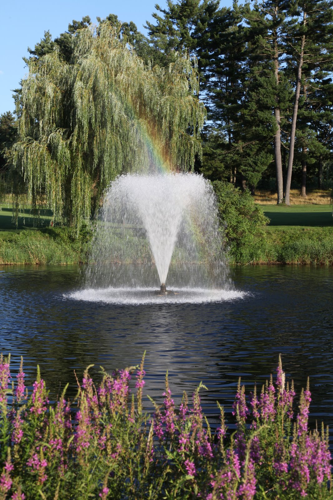This pond and fountain is located on the International Golf Course in Bolton, MA. The senior leadership team from iRobot is having dinner and spending the night at the adjacent conference center in advance of an all day goal setting meeting tomorrow. Enlarging the photo will reveal a nice rainbow formed in the mist from the fountain.