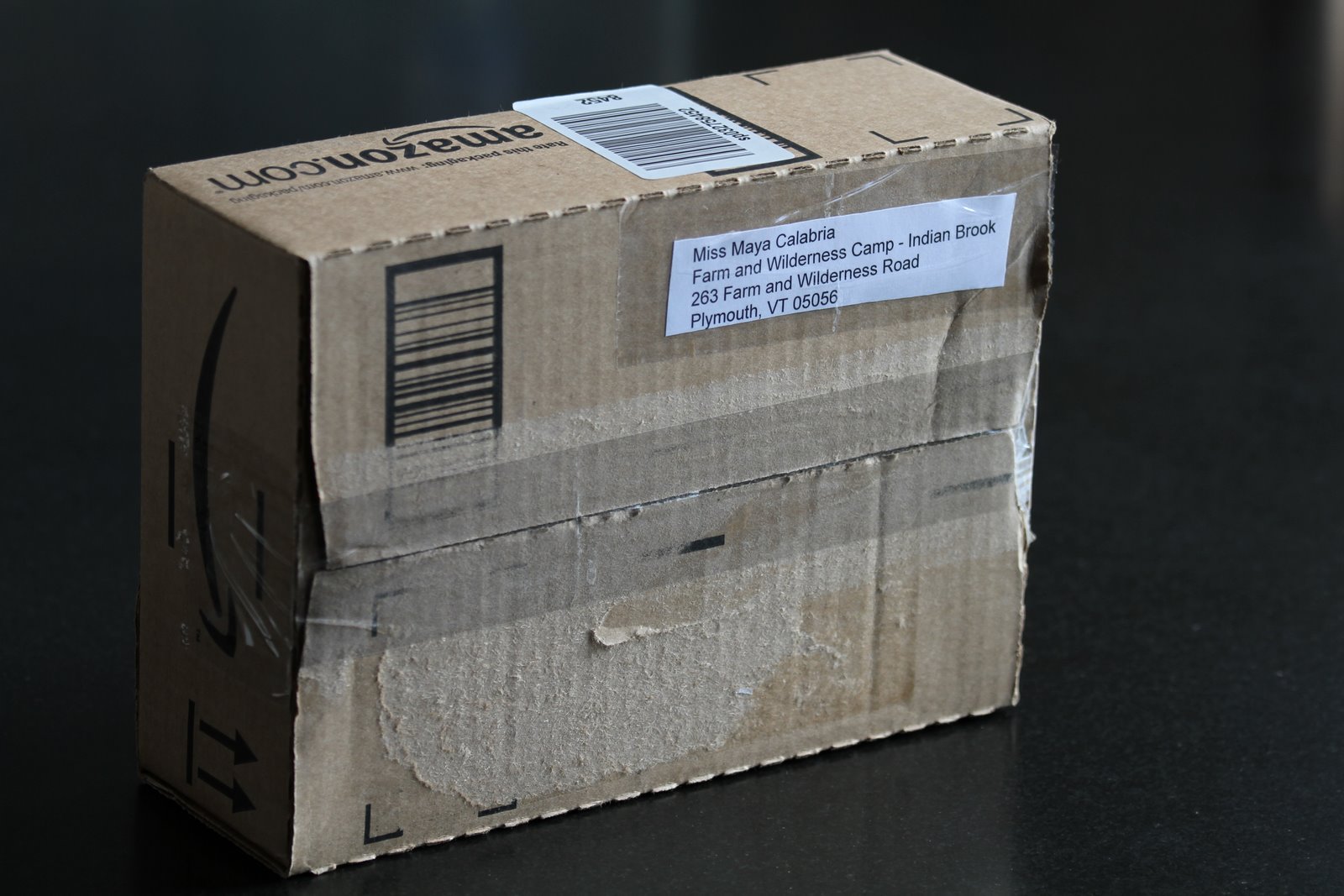 Jeanine normally retrieves the mail from our box and it is not something I am in the habit of doing. This morning I was delighted to find two letters from Maya which arrived earlier this week describing life at camp . Both contain requests for a hair brush and the second a plea for skin moisturizer. Pictured here is a care package prepared by the boys and I which in addition to the requested items includes a letter from each of us and several delectable contraband items.