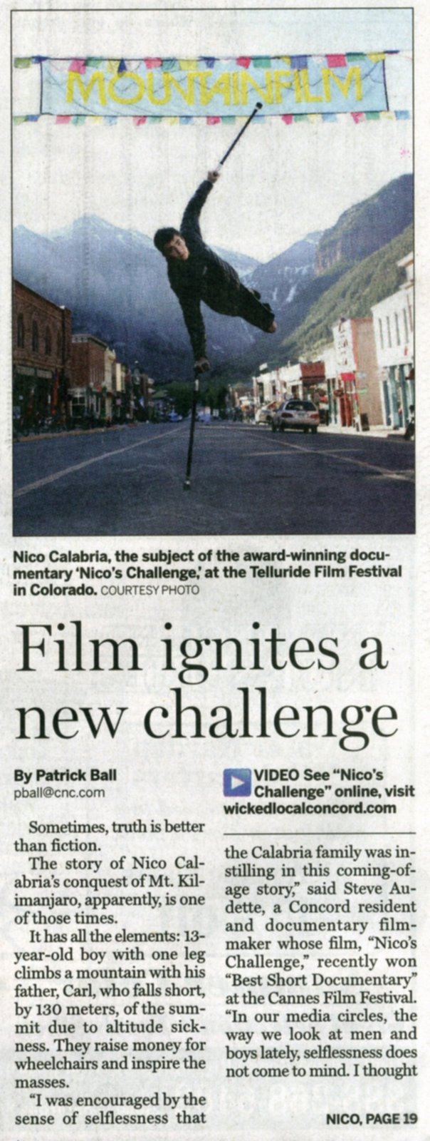 Checking the mailbox today after a week away we found a front page article in the Concord Journal about Nico’s Challenge (the film documenting our Kilimanjaro adventure). Despite a few factual errors, it is a nice piece, the full copy of which can be found by clicking on this link.