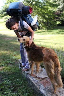 Maya says goodbye to Nala this morning as she prepares to leave for a 3 week summer camp experience in Vermont by way of a weekend visit to her Aunt Susan in Burlington. Among the activities she will enjoy is mountain climbing and she has been walking around the house with her loaded back pack to prepare for the adventure.